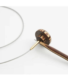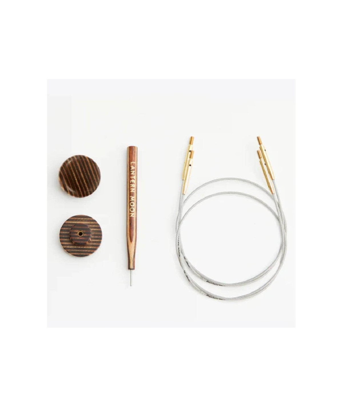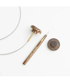 Los cables de Lantern Moon, fabricados en acero inoxidable recubierto de nailon, ofrecen flexibilidad, resistencia y un deslizamiento suave del hilo. El conector, en latón dorado, se combina con topes y una llave de ajuste en madera con punta metálica.