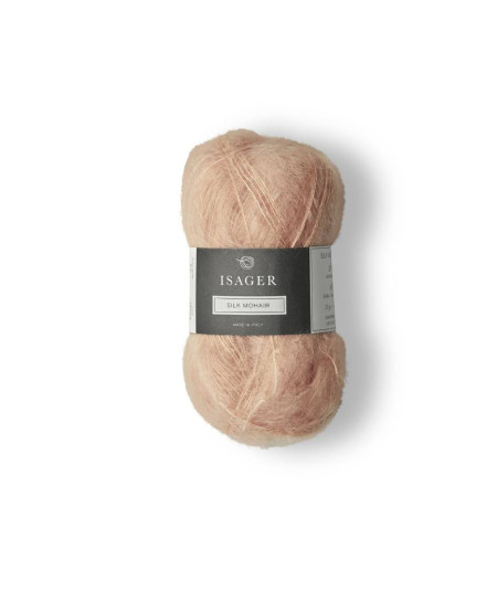 Silk Mohair de Isager es una mezcla 75% de pelo de cabra Mohair y 25% seda, hilado en Italia. El mohair es una fibra que aporta mucho calor y resulta perfecta para tejer prendas caladas y vaporosas. Si quieres jugar con texturas, te recomendamos combinarlo con otros hilos para aportar más cuerpo y caída a tus proyectos