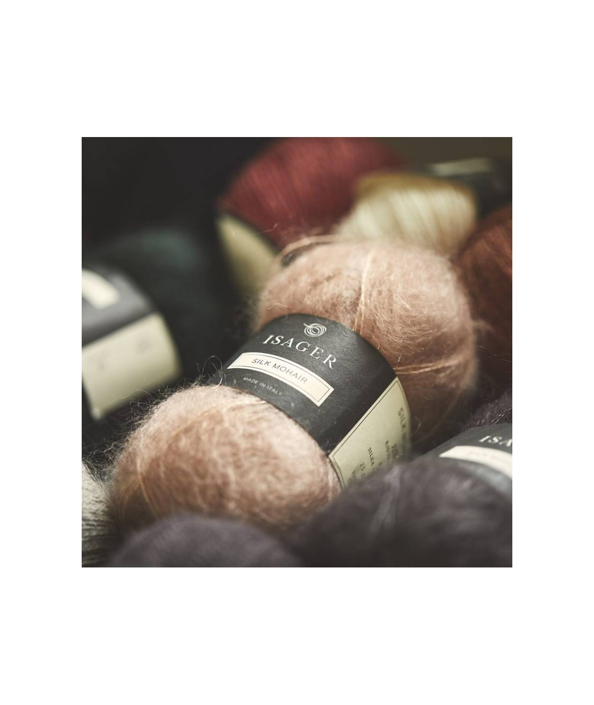 Silk Mohair de Isager es una mezcla 75% de pelo de cabra Mohair y 25% seda, hilado en Italia. El mohair es una fibra que aporta mucho calor y resulta perfecta para tejer prendas caladas y vaporosas. Si quieres jugar con texturas, te recomendamos combinarlo con otros hilos para aportar más cuerpo y caída a tus proyectos