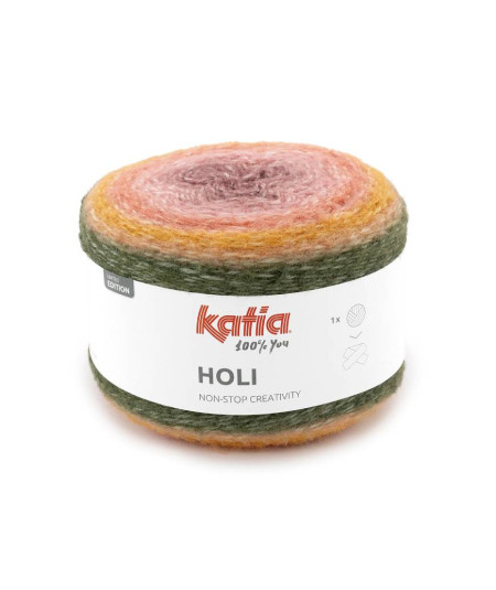 Déjate sorprender por Katia Holi, un hilo único en formato cake de 200 g, con un degradado perfecto que da vida a proyectos llenos de color. Su innovadora mezcla de lana, acrílico y poliamida ofrece una combinación ideal de consistencia, suavidad y un sutil efecto peluche, que marca tendencia esta temporada.