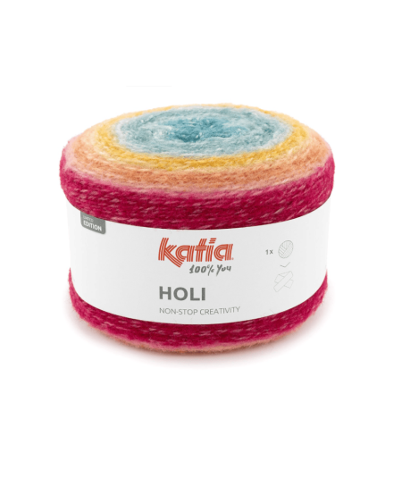 Déjate sorprender por Katia Holi, un hilo único en formato cake de 200 g, con un degradado perfecto que da vida a proyectos llenos de color. Su innovadora mezcla de lana, acrílico y poliamida ofrece una combinación ideal de consistencia, suavidad y un sutil efecto peluche, que marca tendencia esta temporada.