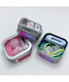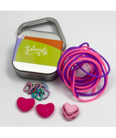 El set lalanalunero consiste en una cajita de hojalata, con tapa transparente, diseñada especialmente para ti. Así podrás tener tus marcadores y accesorios tejeriles siempre a mano, y la podrás llevar en el bolso, en tu bolsa de labores o dónde te dé la lana.