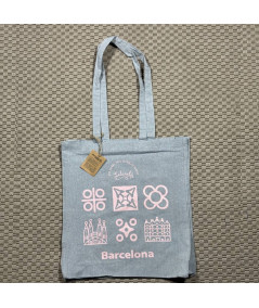 Una bolsa muy lalanalunera de algodón reciclado 100% serigrafriada con motivos icónicos de Barcelona en color rosa, reinterpretados por la diseñadora Ewa Stanczak.