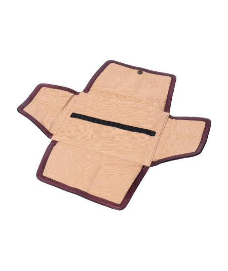 El diseño consiste en un estuche tipo sobre con solapa y cierre de botón a presión. Al abrirlo, se despliega en una sola pieza de cuero con forma de cruz, e incorpora una cinta elástica en el interior para sujetar las agujas de forma segura.